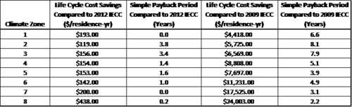 Annual savings from the 2015 IECC are estimated to be between $119 - $438 more than the 2012 version, and from $4,418 - $24,003 per year more when compared to the 2009 IECC. Incremental costs are recovered quickly, across all climate zones, and in all cases homeowners see positive cash flows in less than two years.