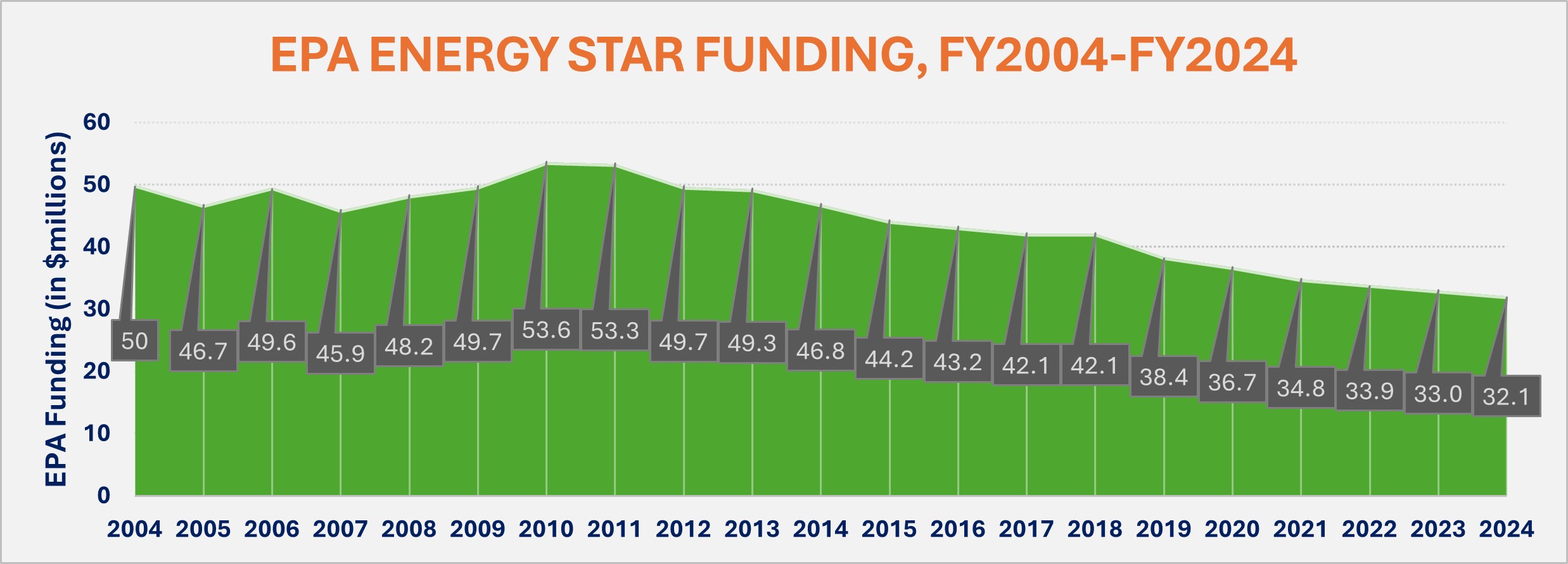 Consider these breakdowns: The ENERGY STAR program saved Americans $42 billion in energy cost savings in 2020 alone. Between FY2007 and FY2011, funding averaged just $58 million annually with EPA providing 87% of the total and DOE kicking in the remainder. If program funding had kept pace with inflation since 1992, the annual budget would be roughly $85 million today. In FY2024, the program received $32.1 million from EPA and $3.6 million from DOE.