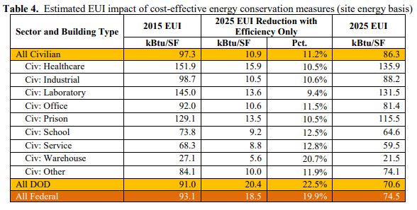 In 2014 the Pacific Northwest National Laboratory (PNNL) reported that existing federal buildings could realize an energy use intensity (EUI) reduction of nearly 20 percent by 2025 (from a 2015 baseline), compared to just a 2.7 percent reduction likely to be realized by the next generation of replacement buildings. (See Table 1.) This represents by far the best opportunity to capture the energy waste reductions necessary to not only realize short-term benefits such as decreased costs, improved performance and comfort, and increased resilience, energy security and economic opportunity; but also to meet long-term sustainability goals.