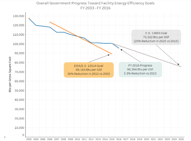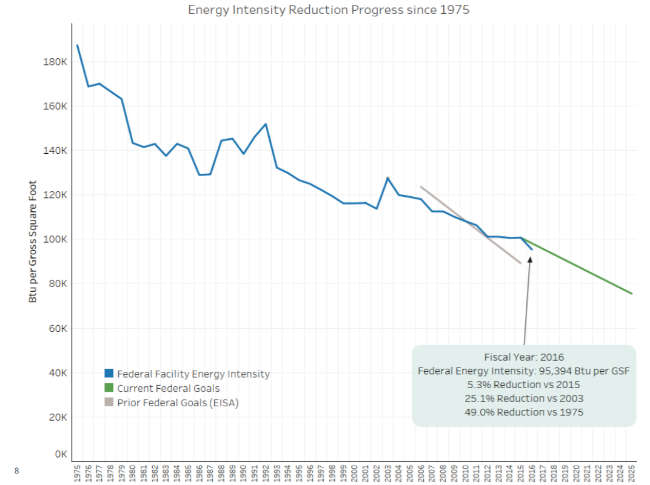 Figure 1. Overall Government Progress Toward Facility Energy Efficiency Goals (FY 2003-FY 2016) and Energy Intensity Reduction Progress Since 1975. Note that the goals (identified by the gray and green bars in the graphs) as extended by E.O. 13693 have been revoked.