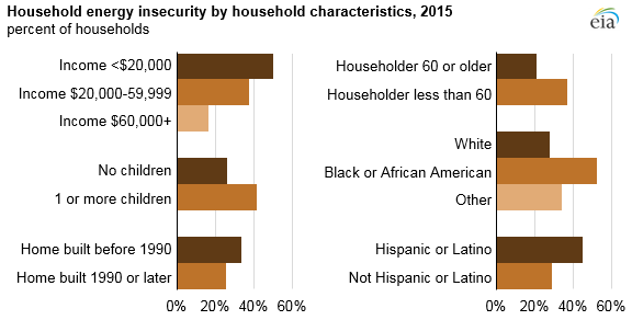 According to EIA’s Residential Energy Consumption Survey, 31 percent of U.S. households face challenges when paying energy bills or adequately heating or cooling their homes. One in five households forgo necessities like food and medicine in order to pay energy bills, forcing difficult tradeo-ffs that impact well-being. These energy insecure households are also more likely to earn less than $20,000 annually and be African-American or Latino. Whereas the median U.S. energy burden is 3.5 percent of a household’s income, low-income households experience a median energy burden of 7.2 percent.