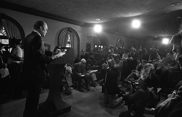 President Gerald Ford makes a statement in the White House press briefing room upon signing the Energy Policy and Conservation Act.