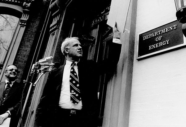 The first U.S. Secretary of Energy, James Schlesinger, stands outside the new Department of Energy.