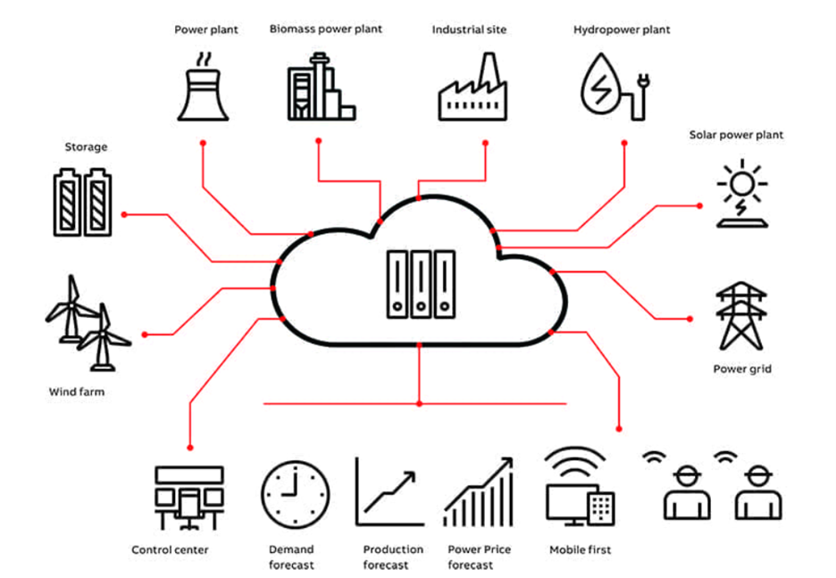 VPP schema: A variety of resources can be incorporated into a virtual power plant (VPP). Special software and analytics can then be used to dispatch aggregate capacity on the energy market. Courtesy: ABB.