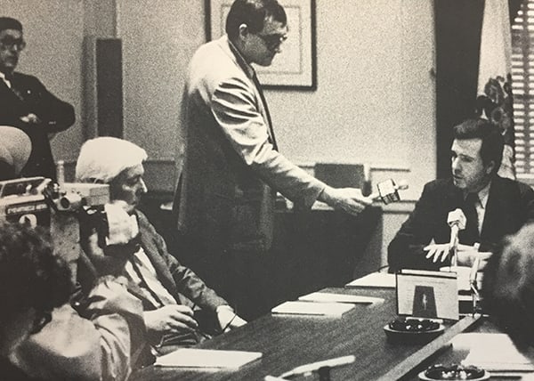 Sens. Charles Percy (left) and Hubert Humphrey at a press conference on their new coalition.